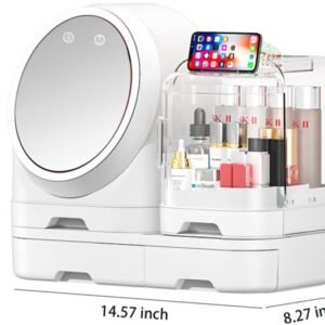 - Split storage structure: The skincare organizer can be divided into three parts for independent use, allowing for increased storage space. It features a small fan, vanity mirror, dimmer light, storage box, and phone holder, all in one space-saving and beautiful unit.