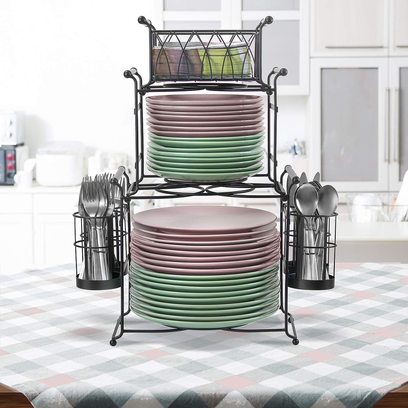 - 7-PIECE BUFFET CADDY (BLACK) — This all-in-one service station keeps dining essentials organized and accessible — Includes (2) center stands for dinner, appetizer, or dessert plates, (4) side flatware compartments, and (1) top napkin basket