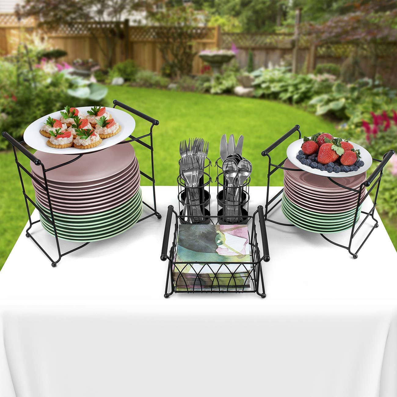 - STACKABLE, DETACHABLE & MULTI-PURPOSE — Stacks for compact presentation or separates to use as individual serving pieces — Napkin holder doubles as condiment server — Plate stands can be used to serve appetizers , desserts, and more