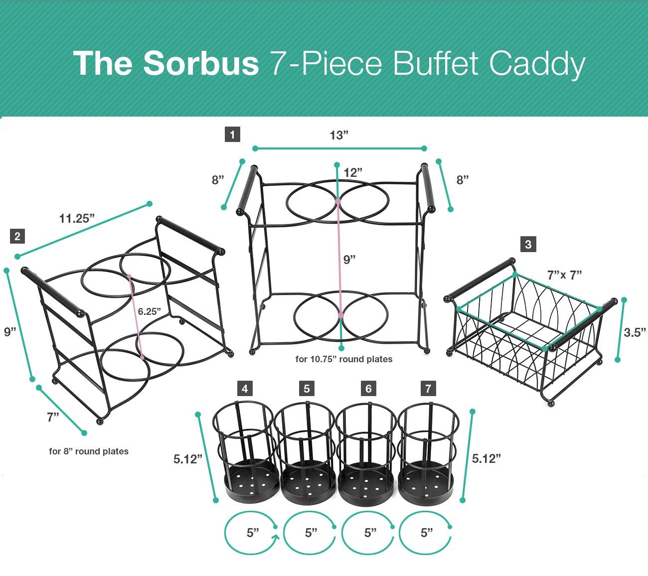 When presentation is everything, serve guests in style with the Sorbus Buffet Caddy! Both elegant and functional, this 7-piece service station keeps dining essentials organized and accessible. It features (1) bottom tier stand for dinner plates, (1) middle tier stand for salad, appetizer, or dessert plates, (4) side flatware holders, and (1) napkin basket. The stackable pieces can be used together for a compact presentation or taken apart as separate serving pieces. Portable side handles allow for easy transport around the buffet. For multi-purpose use, display your favorite appetizers on the plate holder stand or use the napkin basket as a condiment server. Entertain often? Add multiple buffet caddies for hosting large groups. The convenient design is ideal for special occasions and practical enough for everyday dining.