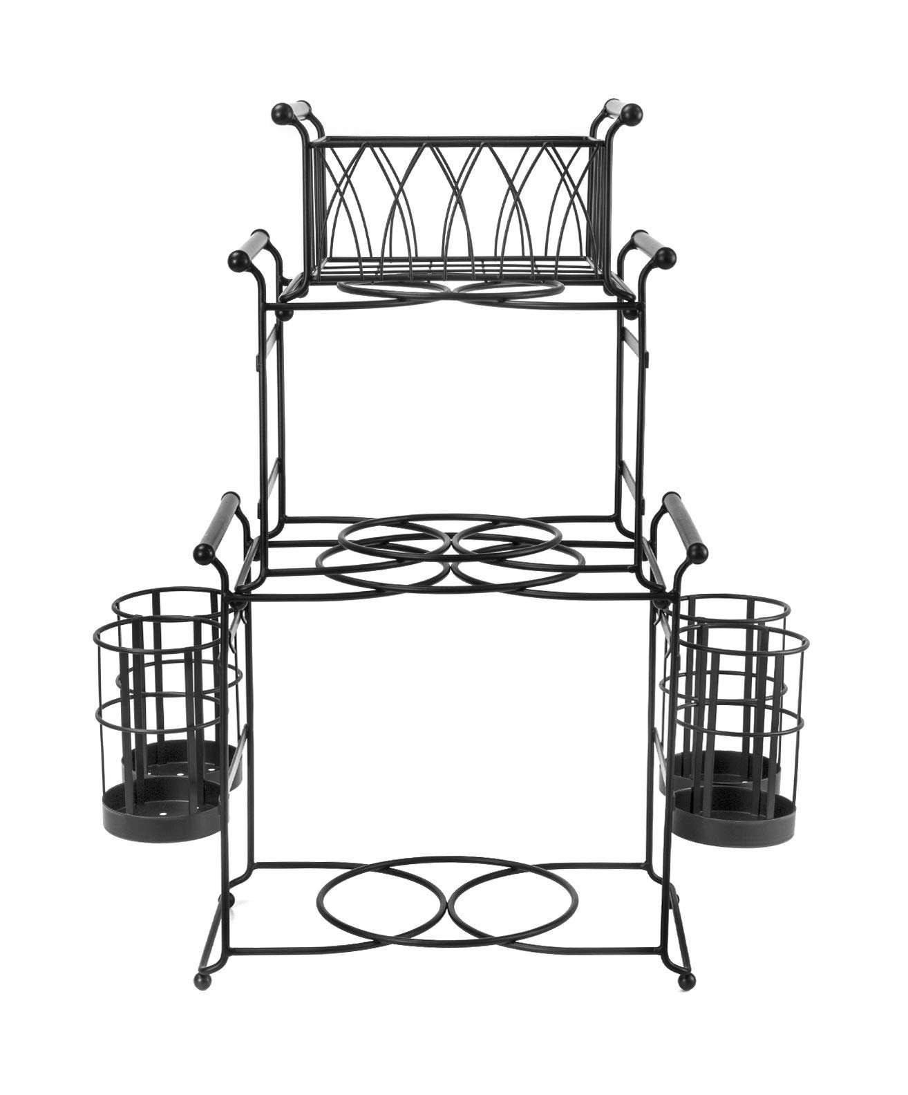 Stacks to free space with a vertical display or detaches as individual serving pieces. Side handles for easy transport. Made of carbon steel with classic black finish. Wipes clean with damp cloth. Holds square napkins 7″ x 7″ or smaller. Holds plates 8″ to 10.75″. Utensil Holders 5”D. Measures Approximately 18.50″ L x 10″ W x 21.75″ H (stacked).
