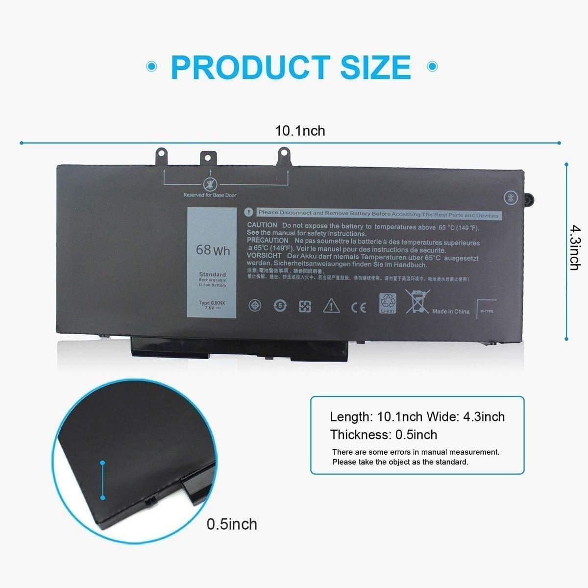 - POWER SPECS: Model: GJKNX 451-BBZG, Battery type: Li-ion, Capacity: 68Wh 8500mAh, Voltage: 7.6V, Cells: 4-A+cell, 100% brand new. Black with two Free Screwdrivers. We have concentrated on the laptop batteries production for more than twenty years. You can use our 68Wh 451-BBZG GJKNX Laptop Battery for Dell Latitude 5590 5480 5580 safely.