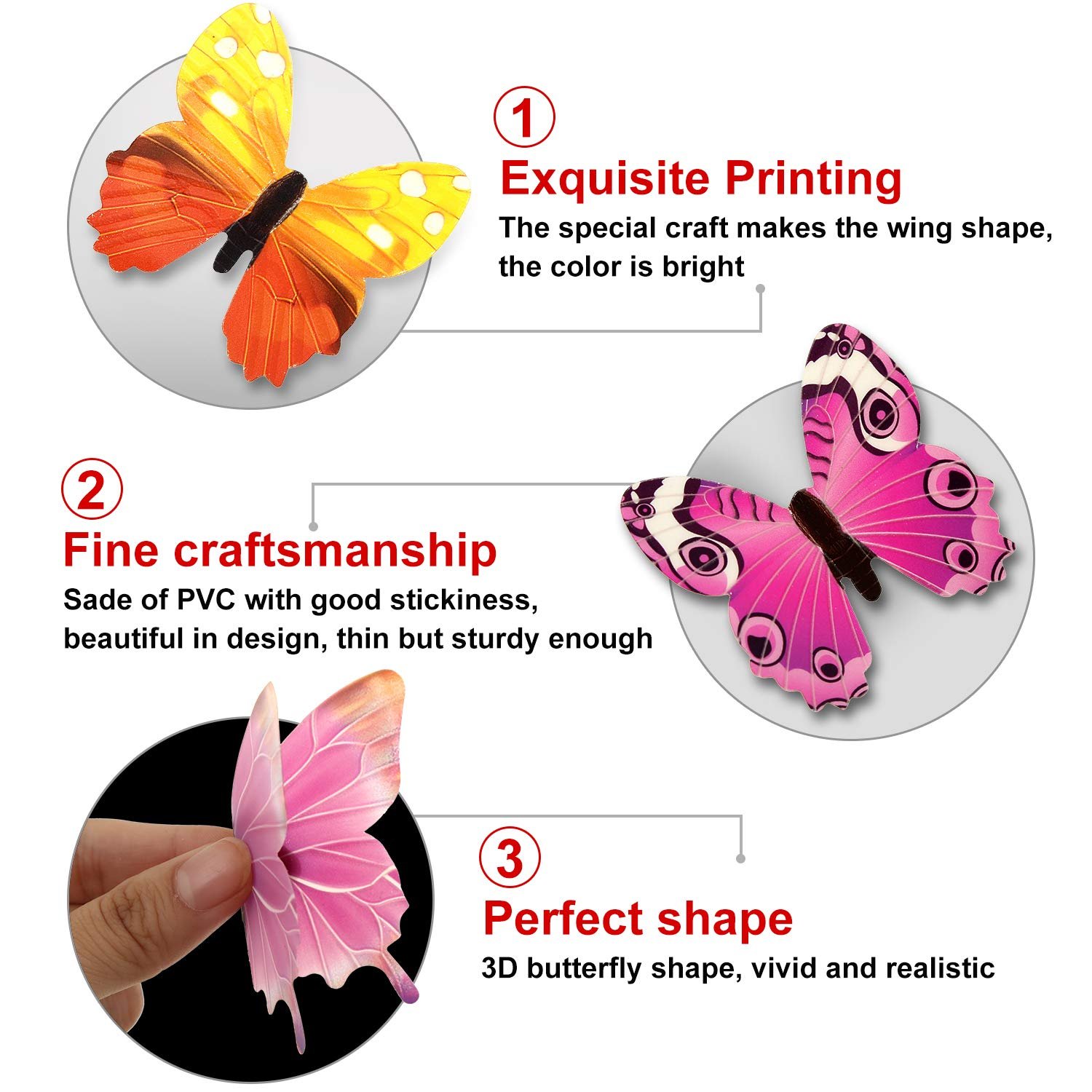 - Package included: each pack contains 96 pieces of 3D butterfly wall stickers in different styles, coming with adhesive tags which allow you paste to the wall quite well, a variety of size and large amount that can satisfy your different decoration needs