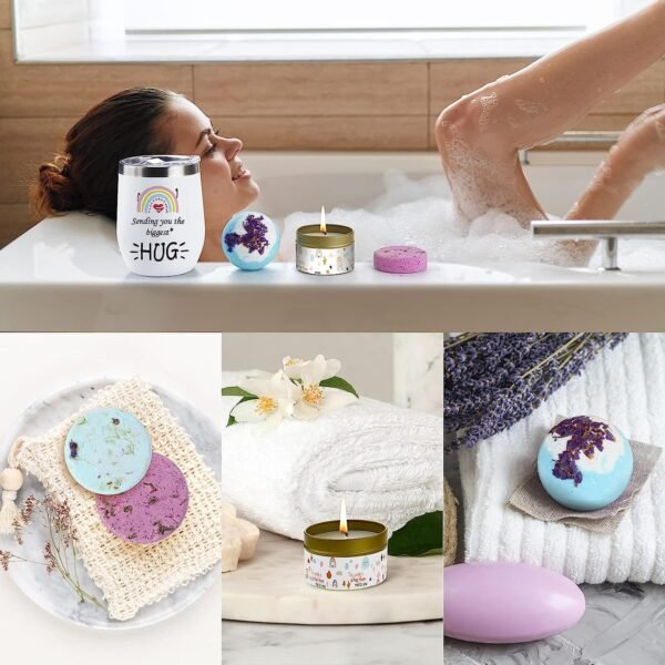 • STRESS RELIEF SPA GIFT SET FOR HER:Help your family / friends feel relaxed in these hard times with our sick care package. At relaxing afternoons, drink a cup of coffee,light candles and watch a movie. At night, place the shower fizzies into the corner of your shower. Allow the heady aromas to whisk you away into relaxation and enjoy your meaningful moment of self care.