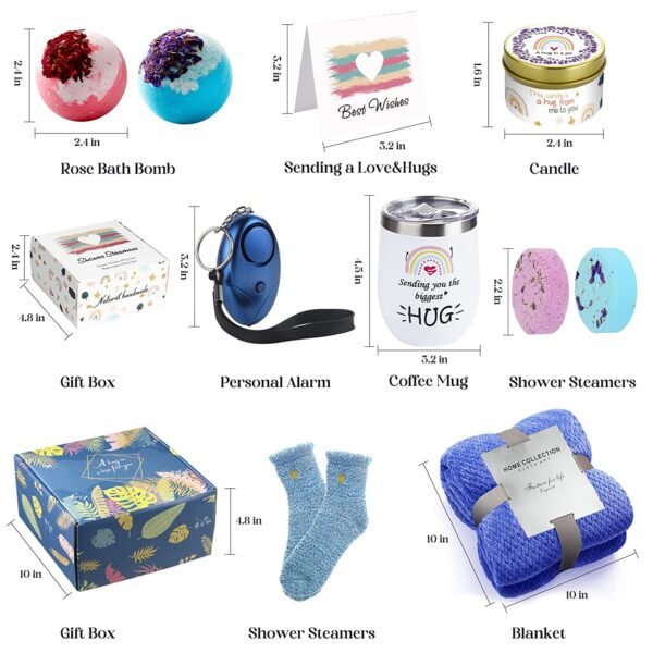 • SEND A GET WELL PACKAGE: Here we will convey your mourning and concern, provide a thoughtful gift box, which includes 1*Blanket,1*12 oz Insulated Tumbler,1*Fuzzy socks,1*Personal Alarm, 1*lavender scented candles,1*all-natural handmade rose soaps,1*rose bath bomb,1 x Sending love & hug notes card,1*Shower Steamens sets.