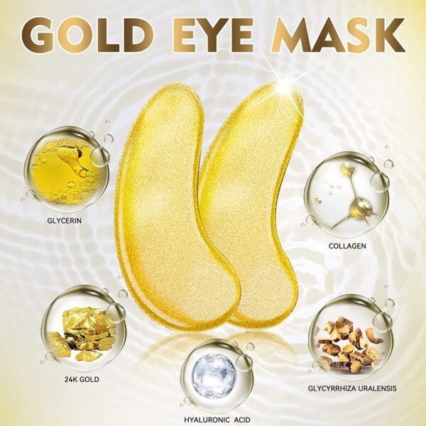 Golden eye mask ingredients: water, glycerin, carrageenin, potassium chloride, glucomannan, dipotassium glycyrrhizinate, sodium hyaluronate, centella asiatica extract, keratina extract, carbomer, allantoin, arginine, hydrogenated castor oil, DMDM hydantoin hydroxyphenyl methyl ester, chlorophenylene glycol ether, Olympic gold foil powder, essence.