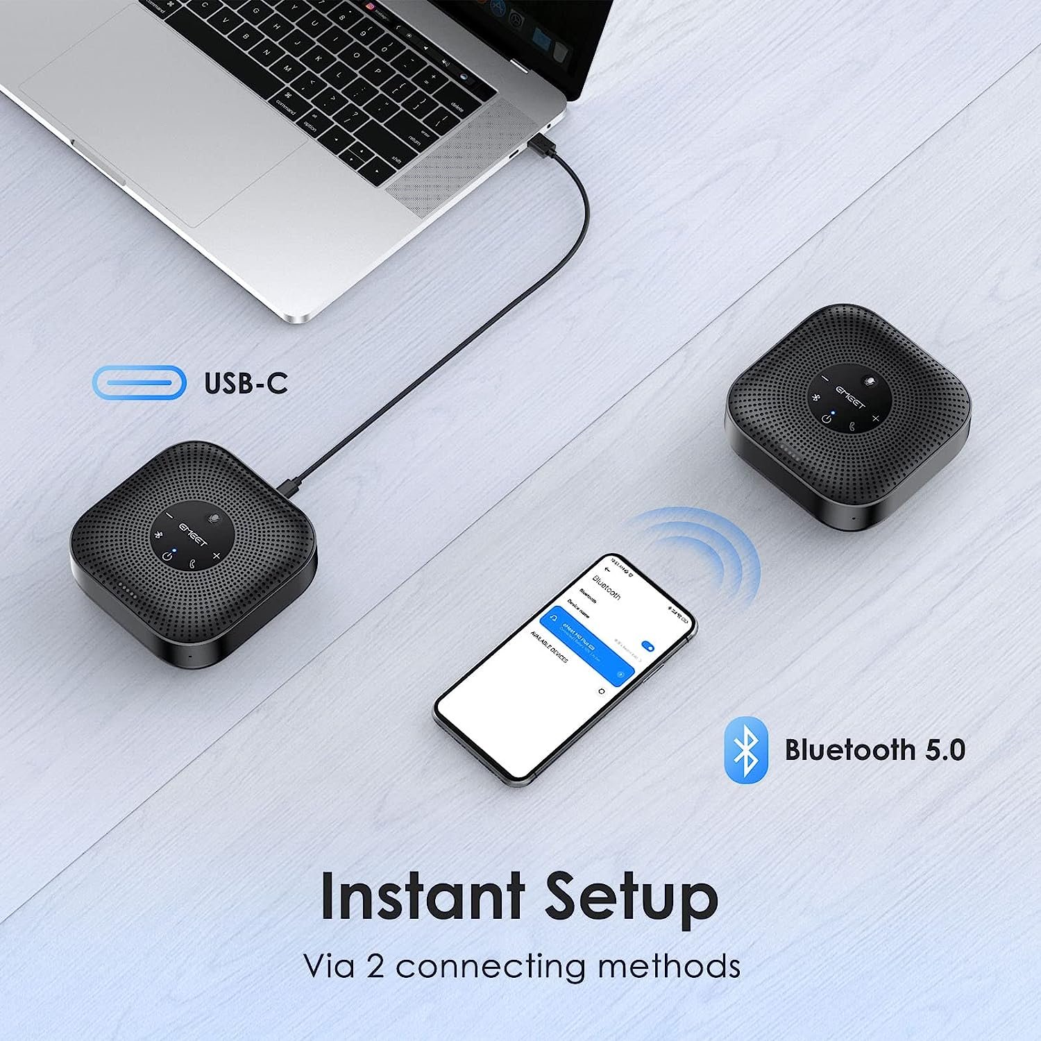 - · [Easy to Set Up and Use] The EMEET Conference Speaker and Microphone M0 Plus offers two ways to connect: USB-C for super stable wired connection, and Bluetooth 5.0 No drivers or additional software is required, simply plug and play. The Bluetooth speakphone is compatible with most conferencing platforms, such as Zoom, Microsoft Teams, Skype for Business, Slack, Webex, and more, so you can start your meeting instantly.