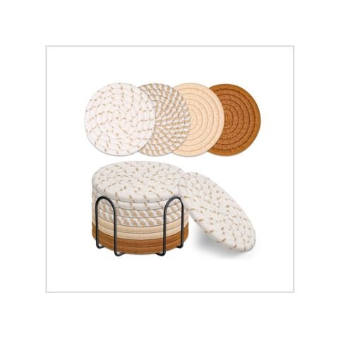 - What You Get: You will get more quantity and more multiple styles coasters from us than any others . You’ll get 8pcs round hand-woven cotton coasters (ultra-minimalist style, 4.3″) and a 4.3″x3.1″ black metal coaster holder.4 colors designs 8pcs in total, which can be used in almost any family scene.