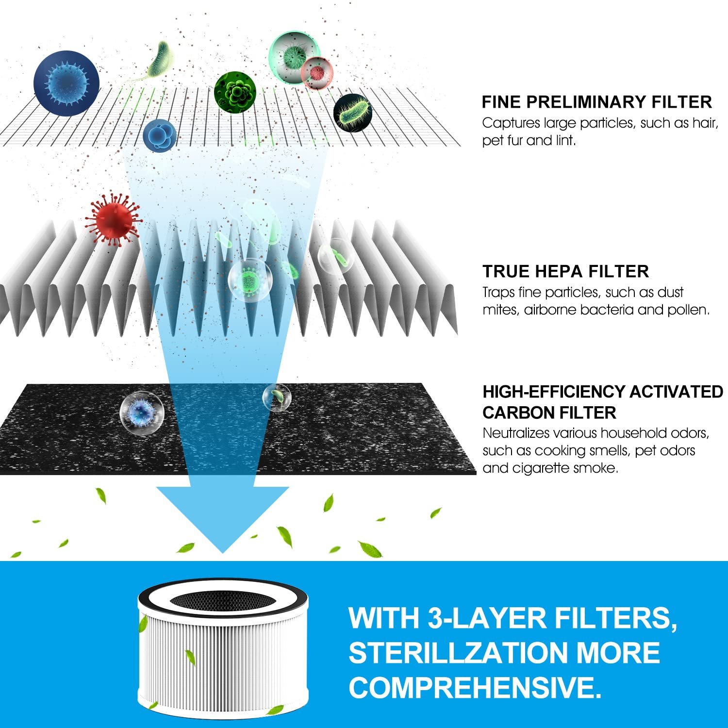 - 3 STAGE FILTRATION: The pre-filter, true H13 HEPA filter and high-efficiency activated carbon filter capture allergens, pet hair, dander, smoke, odor, and large dust particles, removing nearly all airborne contaminants as small as 0.3 microns. Powerful efficient home air purifier prevents respiratory problems, allergic reactions, and asthma.