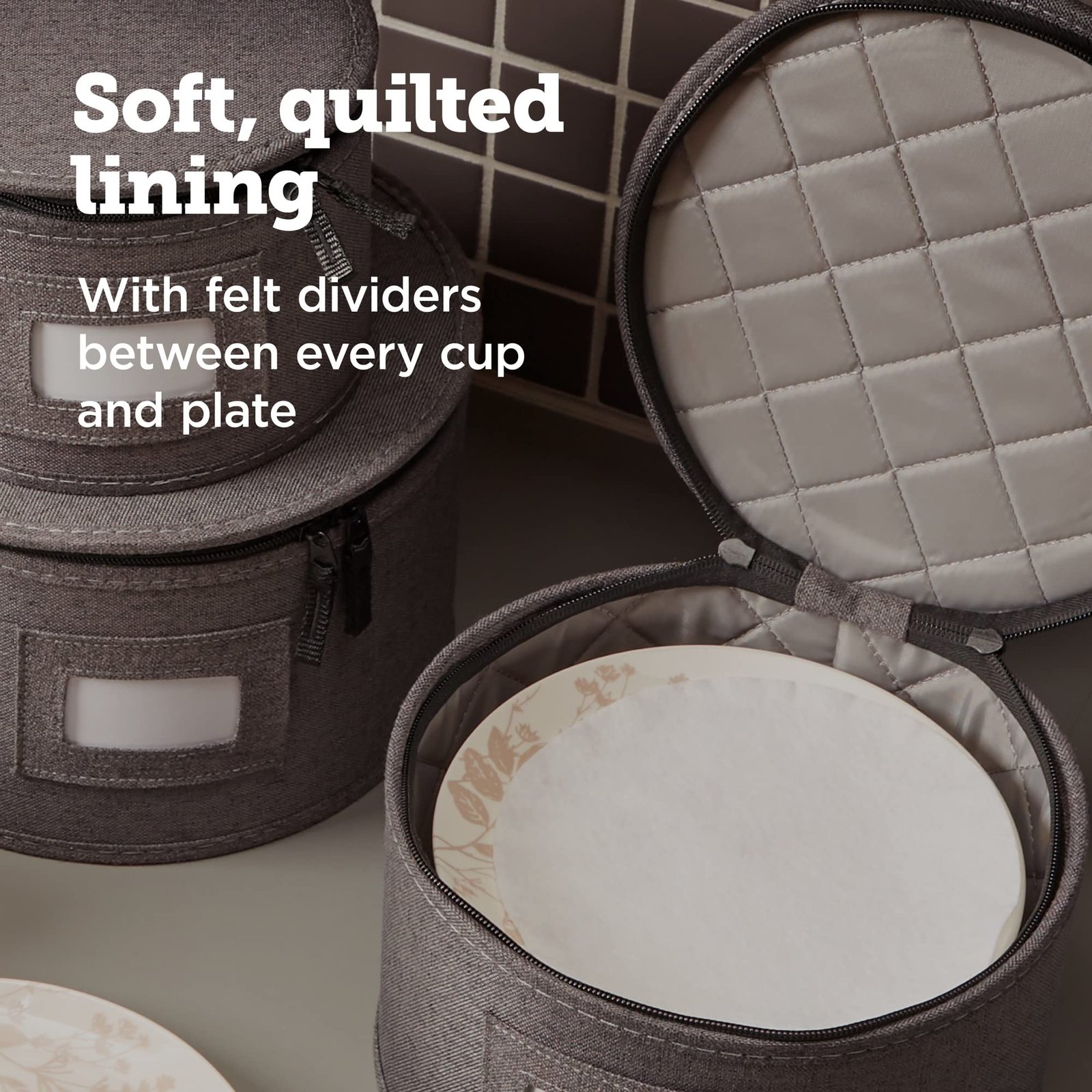 - THE ONLY CHINA STORAGE SET with sturdy bottoms so you can handle your dinnerware with confidence. Every inside surface is lined with soft padding, quality linen fabric exterior.