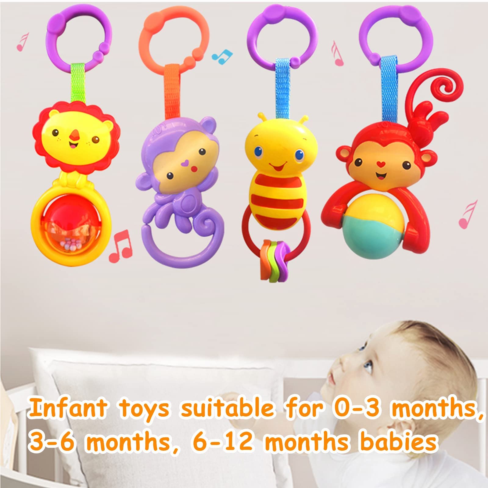 - Stimulate Visual: Lovely animal rattle with vivid expression. The 4 toys include 7 colors of red, orange, yellow, green, blue, purple, and black, easy to attract baby’s attention. Every car seat hanging toys can attract baby’s attention easily and stimulate their visual development.